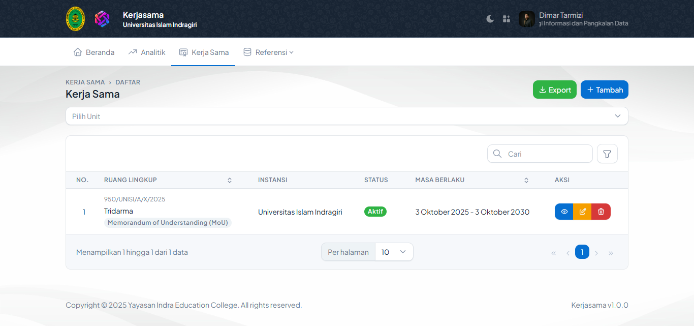 Aplikasi milik internal Universitas Islam Indragiri yang digunakan untuk pengelolaan data kerja sama universitas dengan pihak lain, termasuk MoU dan MoA.